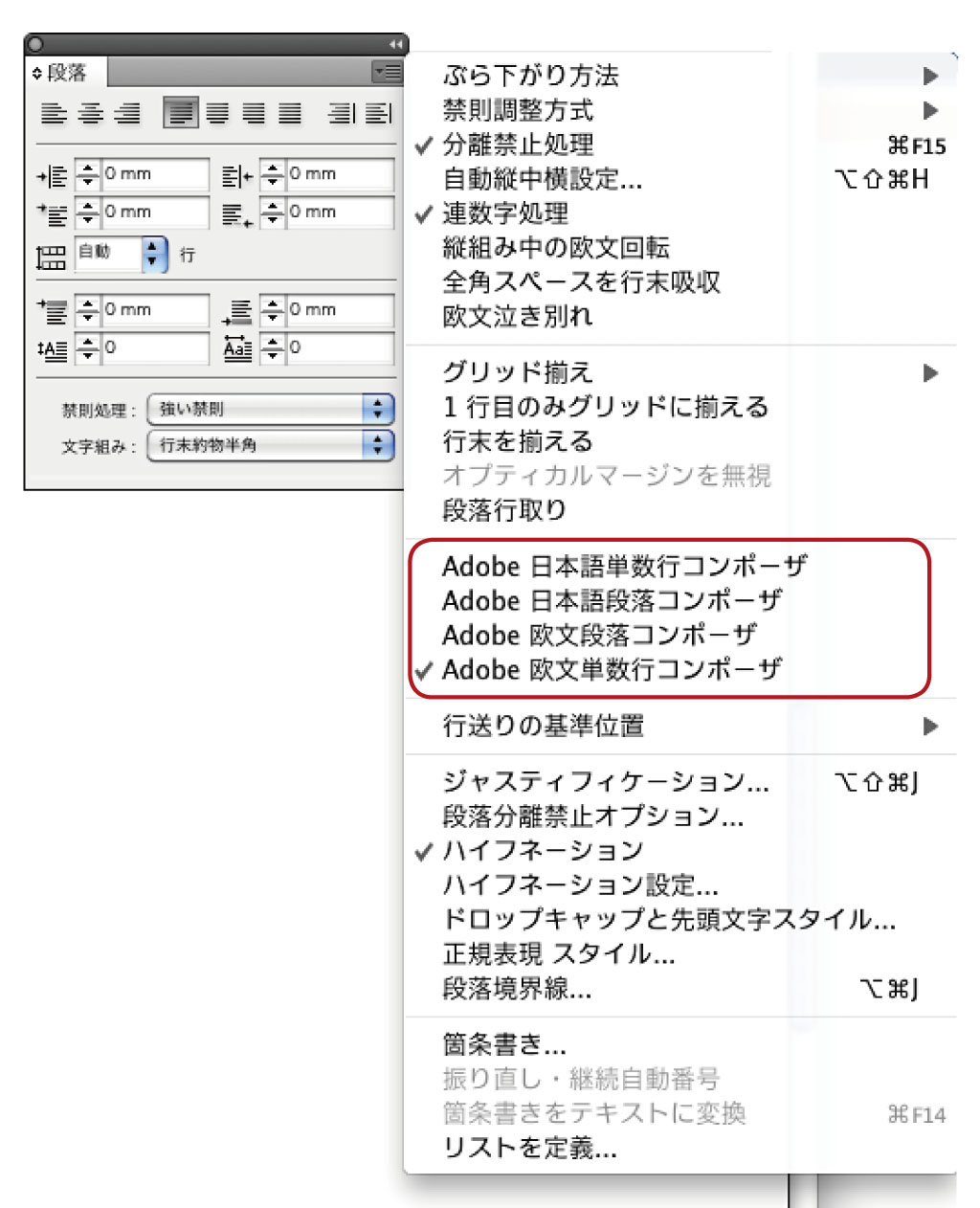 この中の赤枠以外の3つは、すべて和文組版用の設定です。つまり、欧文組版では、赤枠の「欧文ベースライン」を選択するだけでOKです。